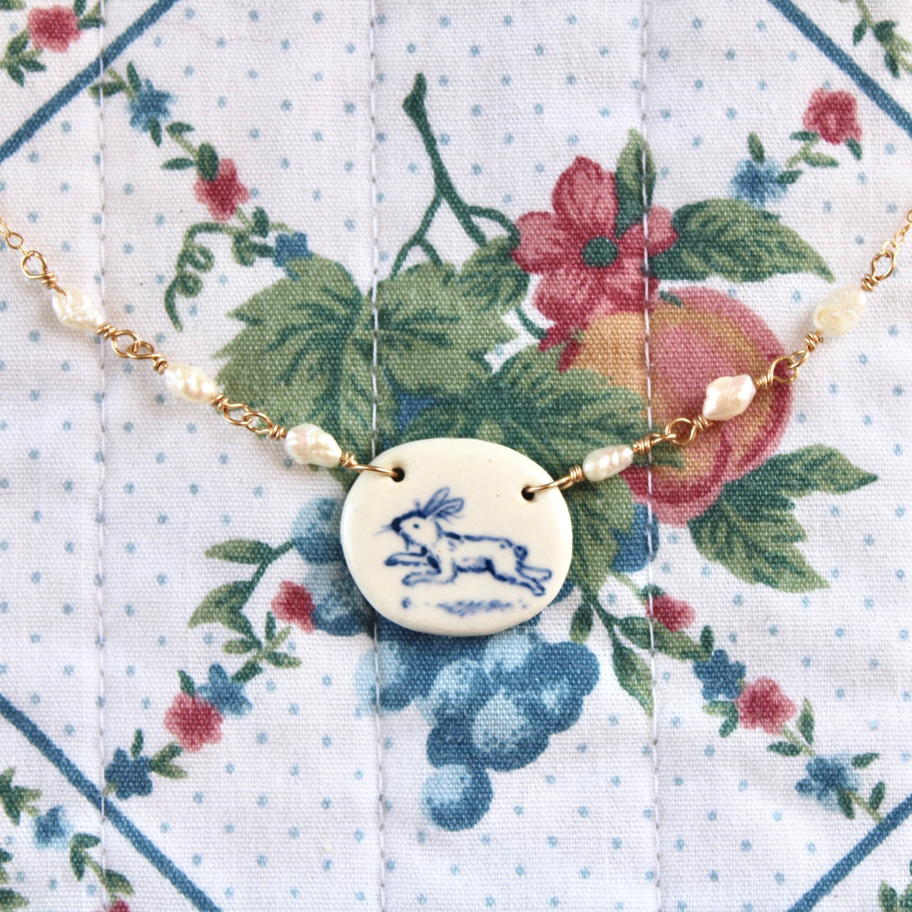 Hand formed & hand painted earthenware ceramic charm necklace with 14k gold filled chain and wire.