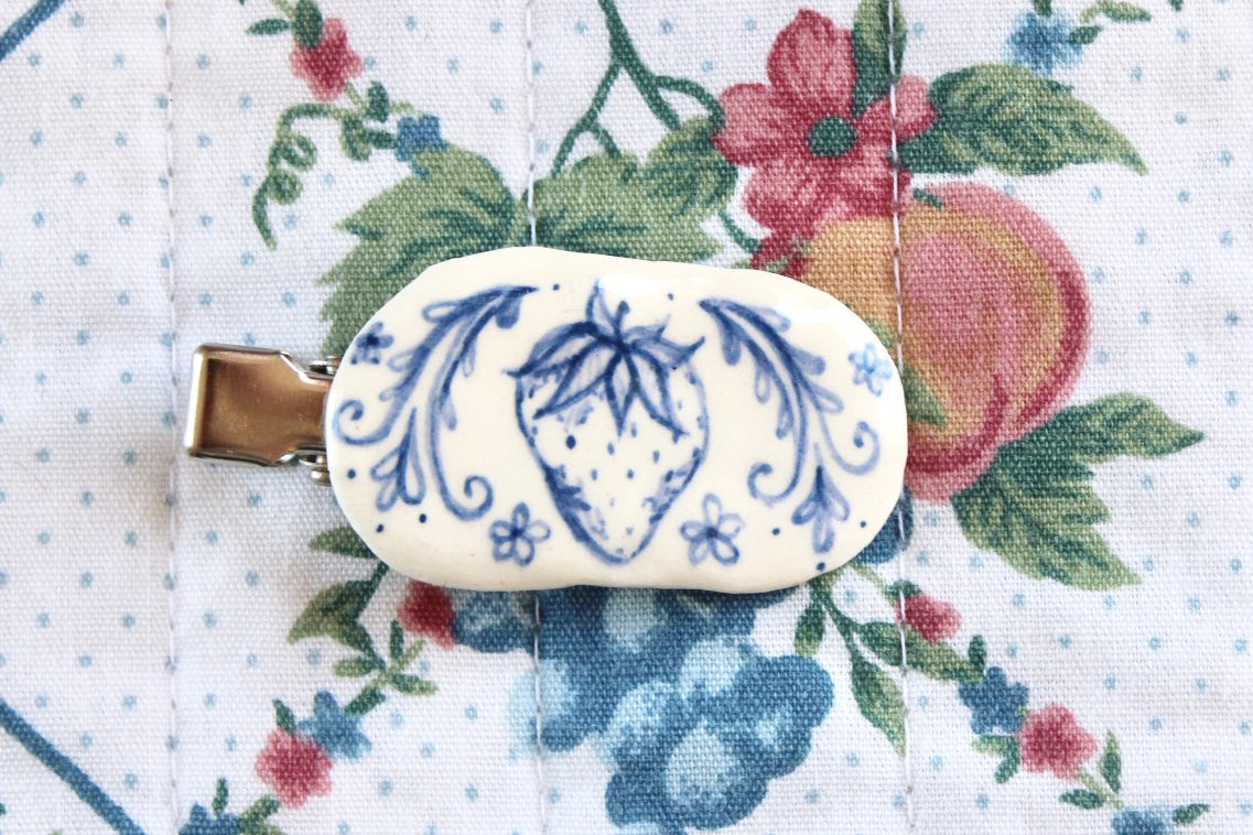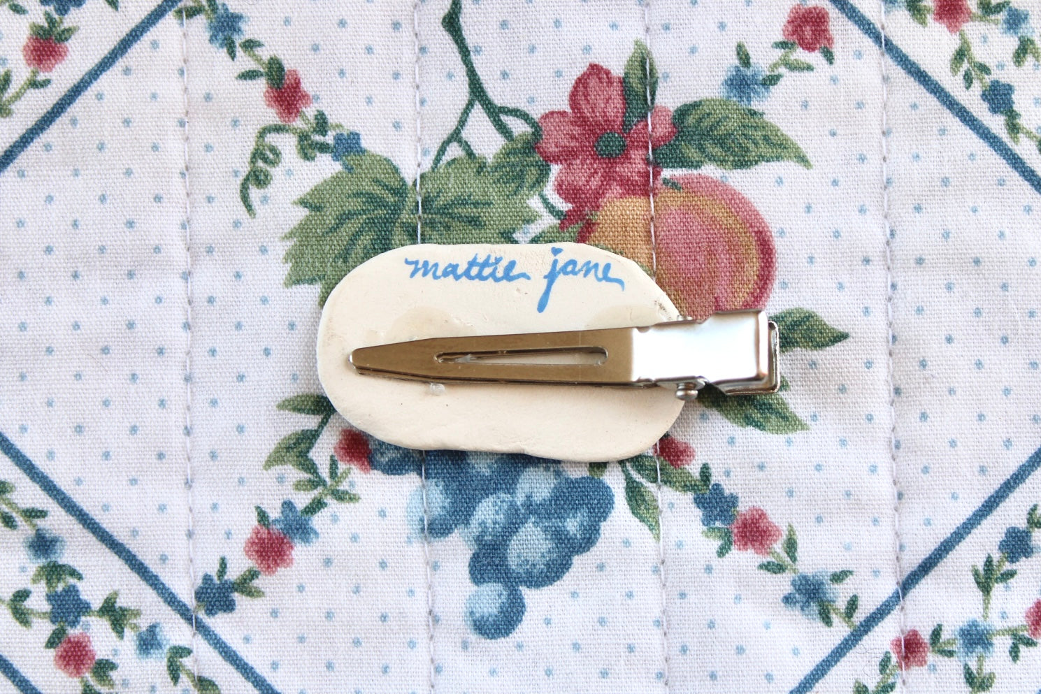 Hand formed & hand painted earthenware ceramic hair clip with silver hardware.