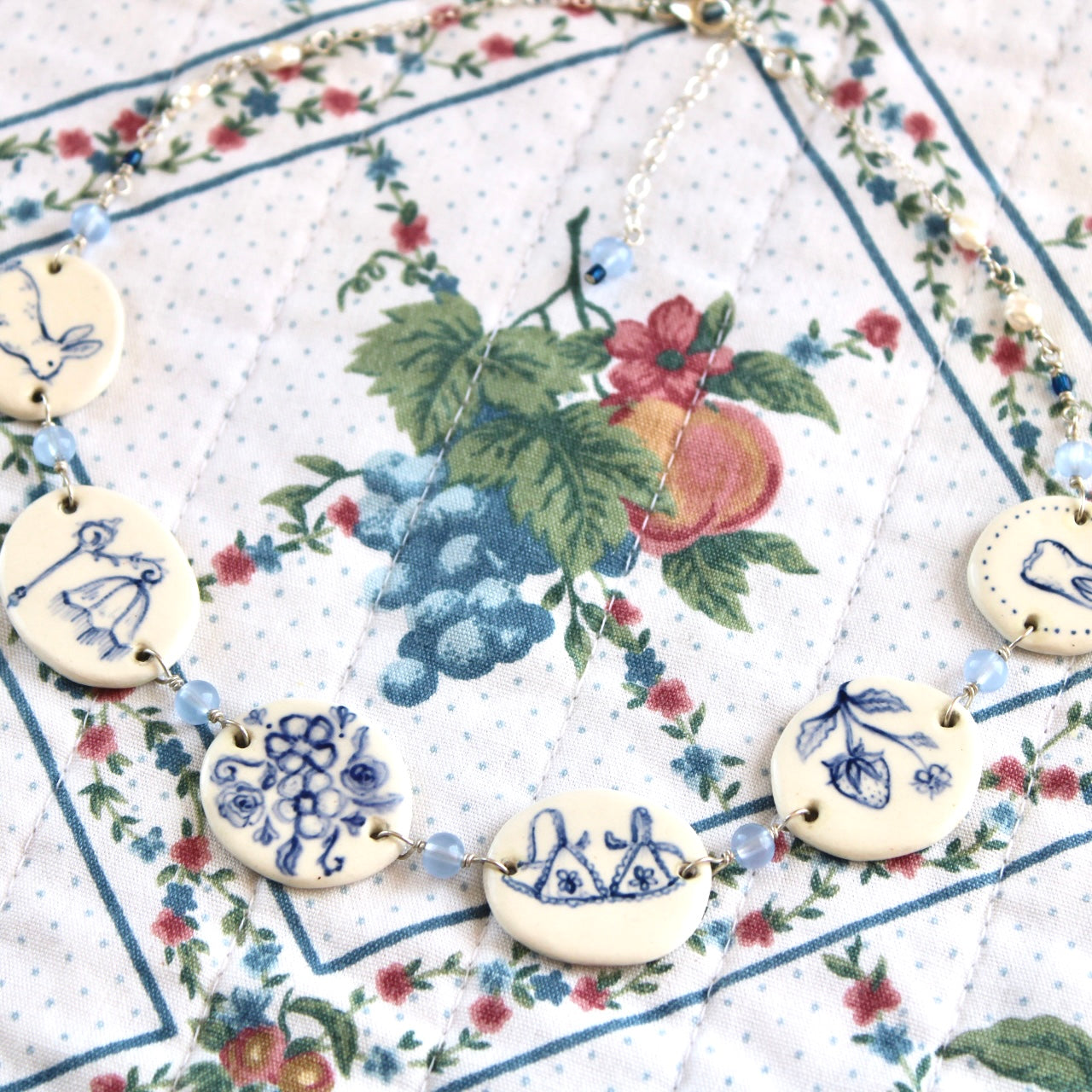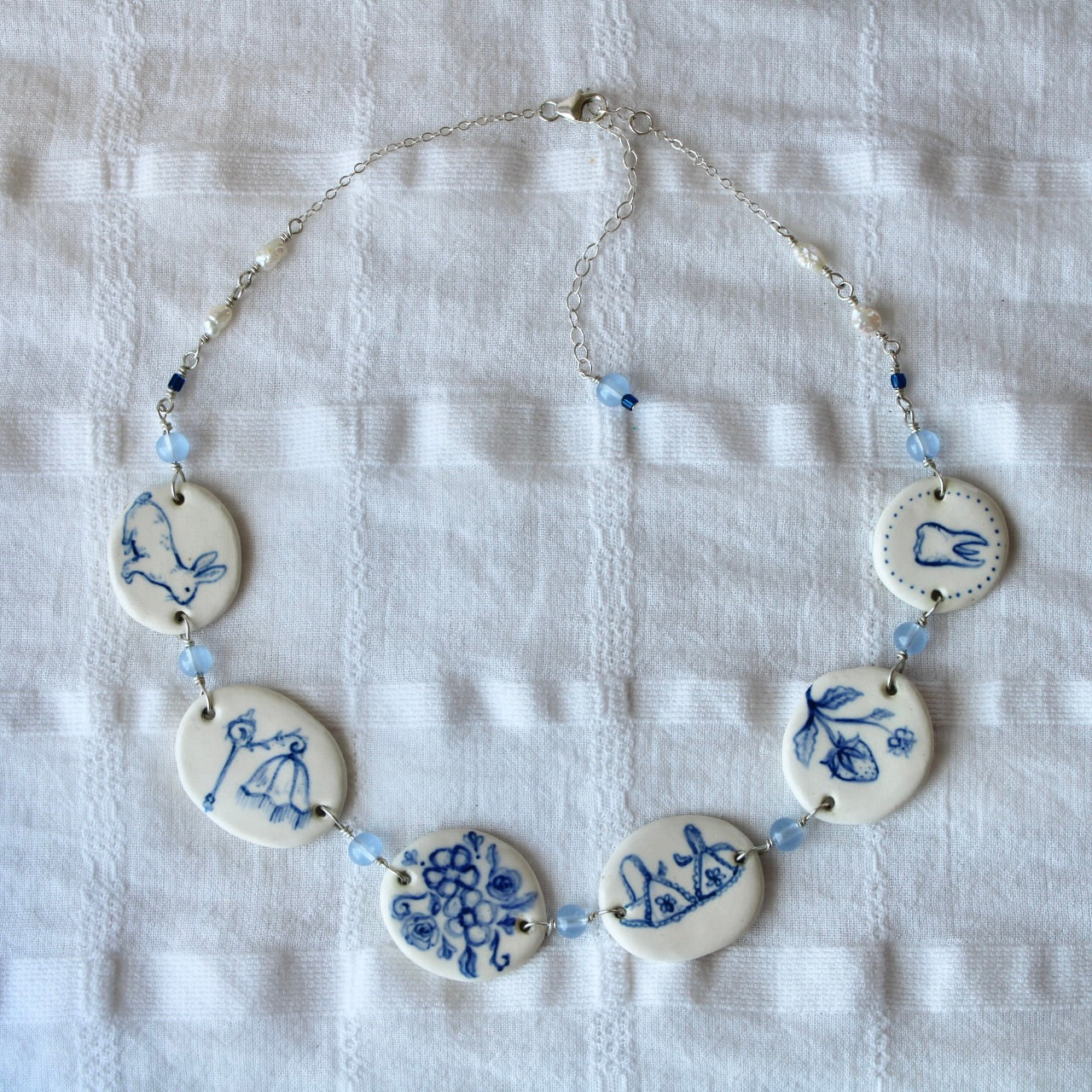 Hand formed & hand painted earthenware ceramic charm necklace with sterling silver chain and wire.